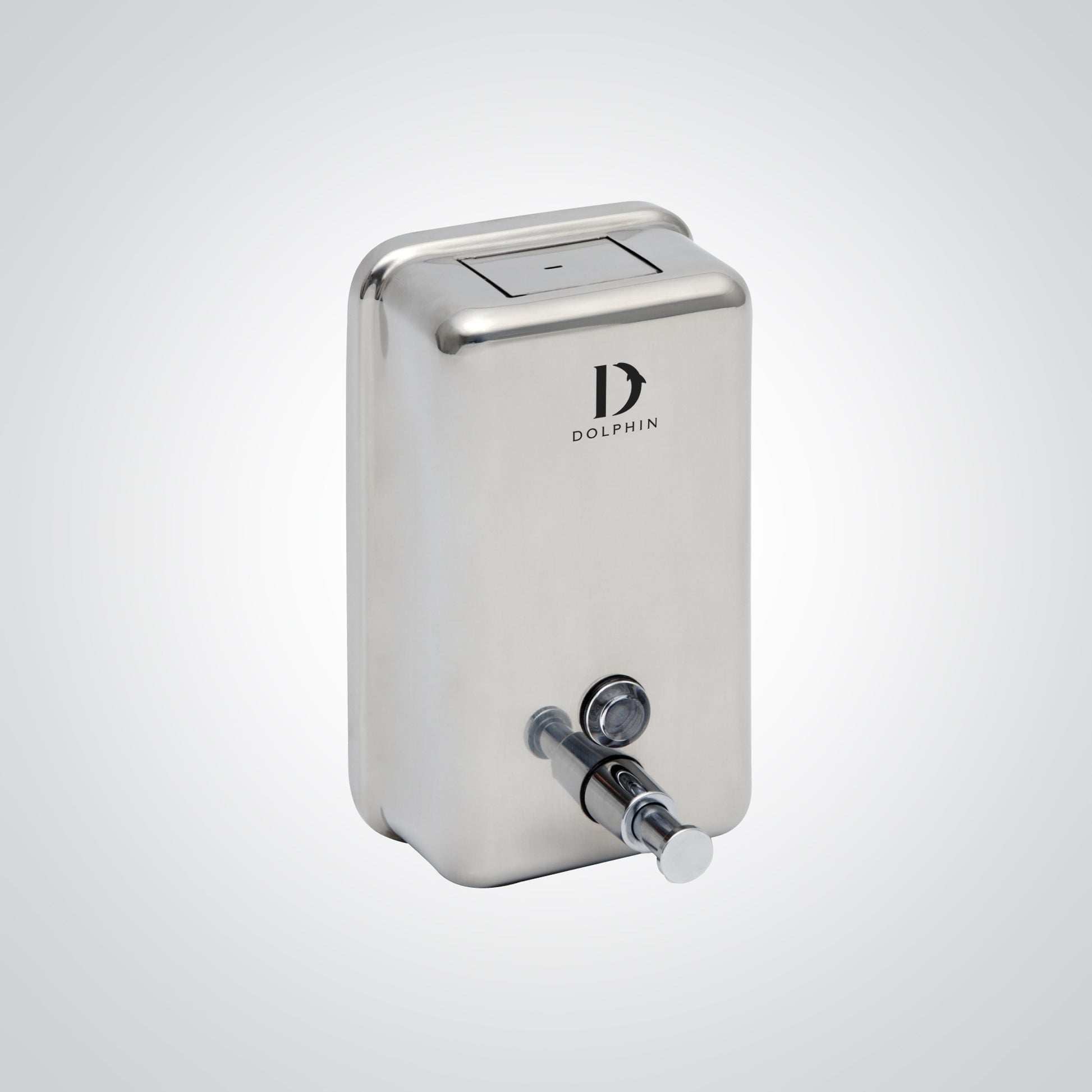 The polsihed stainless steel vertical mounted soap dispenser has a non-drop, one shot action and a lockable feature.